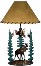 | Moose Lamp with Pressed Foilage Shade | Hickory Lamp with Birch Bark Shade | Hand-Painted Metal Art Moose Lamp with Parchment Shade |