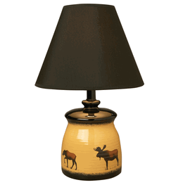 | Moose Lamp with Pressed Foilage Shade | Hickory Lamp with Birch Bark Shade | Hand-Painted Metal Art Moose Lamp with Parchment Shade |